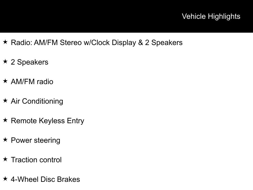 - Radio: AM/FM Stereo w/Clock Display & 2 Speakers